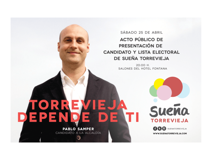 Este próximo sábado 25 de abril, a las 20.00 h en los salones del Hotel Fontana, presentaremos públicamente a nuestro candidato Pablo Samper y la lista electoral. 25 torrevejenses dispuestos a convertirse en las impulsores de un cambio profundo en la forma de gestionar Torrevieja y de entender la política como un instrumento para que todos nos impliquemos y decidamos cómo va a ser nuestra ciudad a partir del 25 de mayo.