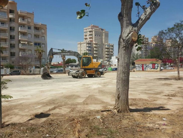 El solar fue usado como zona de acopio de materiales y de escombros en la reforma urbanística de la zona incluida en el Plan Confianza, y tras la finalización de la obra, que incluía su conversión en una zona verde y que no se llevó a cabo por la urbanizadora ante el silencio cómplice del PP, fue abandonado a su suerte convirtiéndose en un pipican de mascotas, escombrera puntual y cementerio de palmeras afectadas por el picudo.