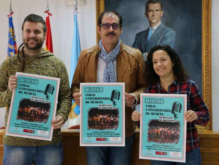 El concejal de Cultural Alejandro Blanco, ha presentado el concierto didáctico infantil “Musicales de Brodway” acompañado por los componentes de la Sección Moderna de la Coral Universitaria de Murcia, Pepe Alacid, Juan Diego Celdrán y Cristina Pina. El concierto, cuyo objetivo principal es atraer la atención de niños y jóvenes hacia la música clásica, tendrá lugar el viernes 4 de diciembre a las 20 horas en el Centro Cultural Virgen del Carmen.