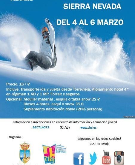 El Concejal de Juventud y Deportes, Pablo Samper Hernández ha informado de que la Concejalía de Juventud, a través del Centro de información y animación juvenil, ha abierto de nuevo el plazo de inscripción para el viaje a la nieve 2016, tras haber sido cancelado para la fecha en la que estaba previsto. Siempre y cuando la climatología lo permita, se realizará el fin de semana del 4 al 6 de marzo.