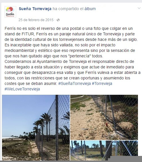 Sueña Torrevieja hizo pública el 25 de Febrero del pasado año una publicación en contra de esta aberración medioambiental con imágenes que ilustraban cómo las obras de este alambrado dañaron parte del terreno y su palmeral. La empresa Ferris Hills justificó esta actuación como medida preventiva para evitar actos vandálicos, llegando a intercambiar varios escritos públicamente vía Facebook con uno de los miembros de nuestra área negando haber dañado el terreno durante y después de las obras.