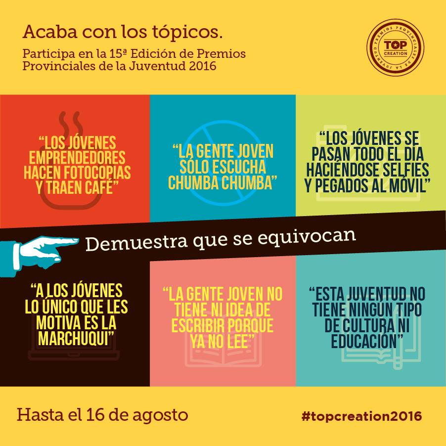 El concejal de Juventud anima a todos aquellos jóvenes con talento a que se presenten a este concurso “demostrando así que la sociedad se equivoca con respecto a la participación juvenil”. Los interesados pueden obtener más información y recoger las bases y solicitudes en el Centro de Información y Animación Juvenil (CIAJ) sito en Paseo Juan Aparicio, 5, en horario de 9 a 14 horas. Más información en www.topcreation.es