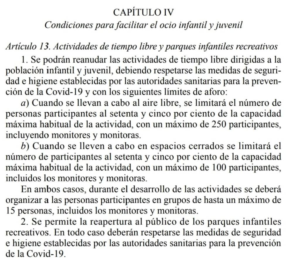 “Se permite la reapertura al público de los parques infantiles recreativos. En todo caso deberán respetarse las medidas de seguridad e higiene establecidas por las autoridades sanitarias para la prevención de la COVID-19”