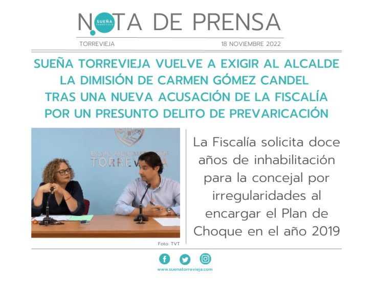 Pablo Samper, portavoz de Sueña Torrevieja, afirma que “hoy nos hemos despertado con otro escándalo en el equipo de Gobierno del PP de Torrevieja, de nuevo protagonizado por la concejal Gómez Candel. Cada minuto que pase y el alcalde de Torrevieja siga manteniendo en sus cargos a la Sra. Gómez, es una afrenta a nuestra corporación municipal, a nuestra democracia y al pueblo de Torrevieja”.