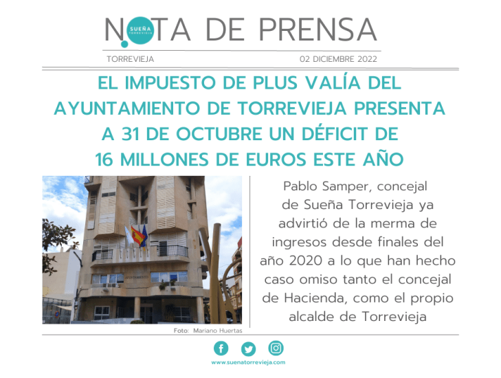 Pablo Samper, portavoz de Sueña Torrevieja asegura que “el mes de octubre de 2022 es el segundo mes del año junto con el de enero, cuya recaudación del impuesto de plus valía ha sido negativa, al haberse realizado devoluciones por liquidaciones indebidas superiores a los derechos reconocidos”.