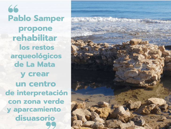 Pablo Samper, candidato a la alcaldía de Sueña Torrevieja, propone “la rehabilitación y difusión de los restos arqueológicos del embarcadero de La Mata y del norte de la Laguna, así como la construcción de un centro de interpretación donde exponer el numeroso material arqueológico hallado en las inmediaciones del yacimiento, incorporar paneles explicativos, diseñar recorridos accesibles y realizar visitas teatralizadas. Así mismo, dicho proyecto traería consigo la adecuación integral de las calles Emperadores y Lecha, la creación de una zona verde en todo el entorno afectado y un parking disuasorio de gran capacidad para uso público”.