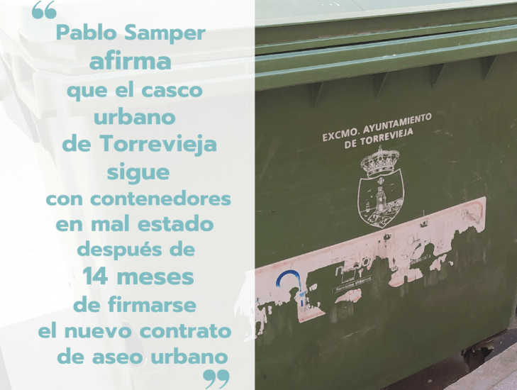 Pablo Samper, portavoz de Sueña Torrevieja, explica que “ya han pasado 14 meses desde la firma del contrato, y el caso urbano de Torrevieja sigue sin disponer de los nuevos contenedores que deberían estar colocados desde el 30 de octubre de 2022”.