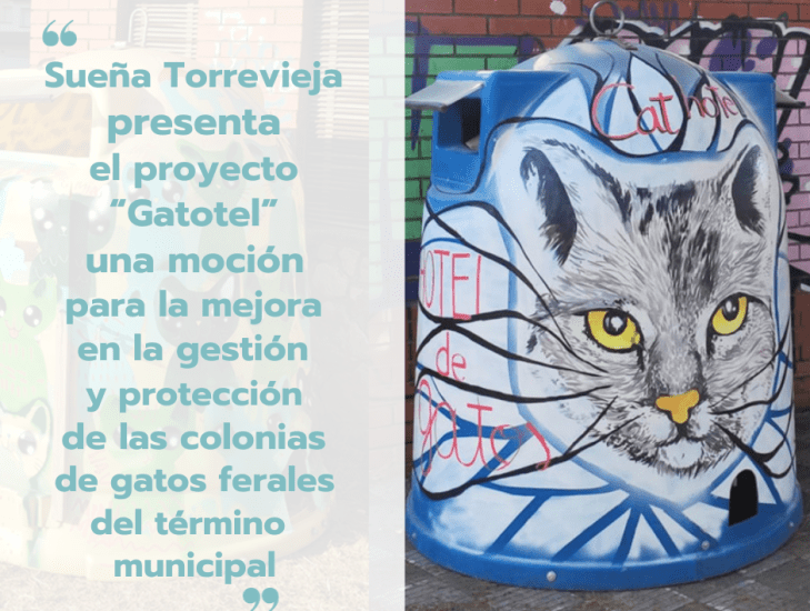 Alejandro Martín, vocal de la ejecutiva de Sueña Torrevieja afirma que, “llegan los Gatoteles”. Torrevieja cuenta con más de 2.500 gatos callejeros. Por todos es sabido que gracias a la gran labor que realiza el voluntariado, nuestros vecinos felinos tienen una oportunidad de supervivencia. La siguiente iniciativa supone un paso más para la mejora del bienestar animal y así minimizar las molestias vecinales.