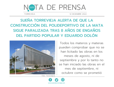 SUEÑA TORREVIEJA ALERTA DE QUE LA CONSTRUCCIÓN DEL POLIDEPORTIVO DE LA MATA SIGUE PARALIZADA TRAS 8 AÑOS DE ENGAÑOS DEL PARTIDO POPULAR Y EDUARDO DOLÓN