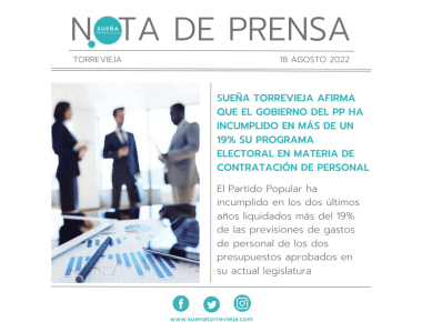 SUEÑA TORREVIEJA AFIRMA QUE EL GOBIERNO DEL PP HA INCUMPLIDO EN MÁS DE UN 19% SU PROGRAMA ELECTORAL EN MATERIA DE CONTRATACIÓN DE PERSONAL